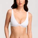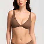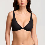 - Unpadded plunge cups enhance natural silhouette without added bulk