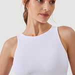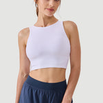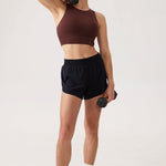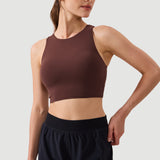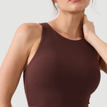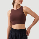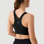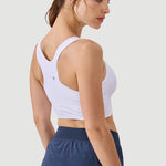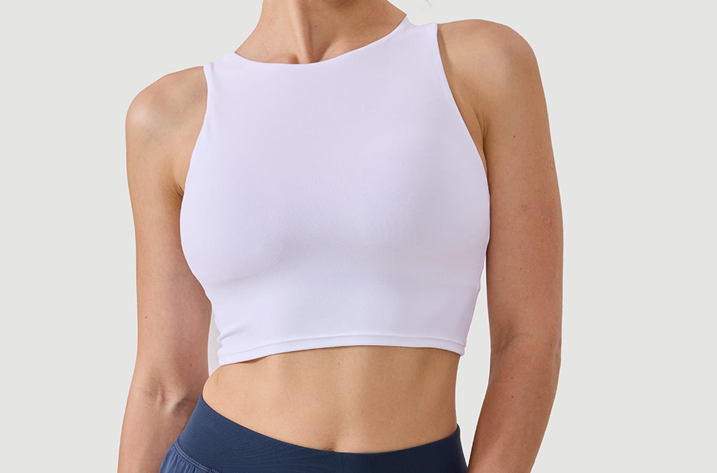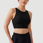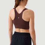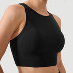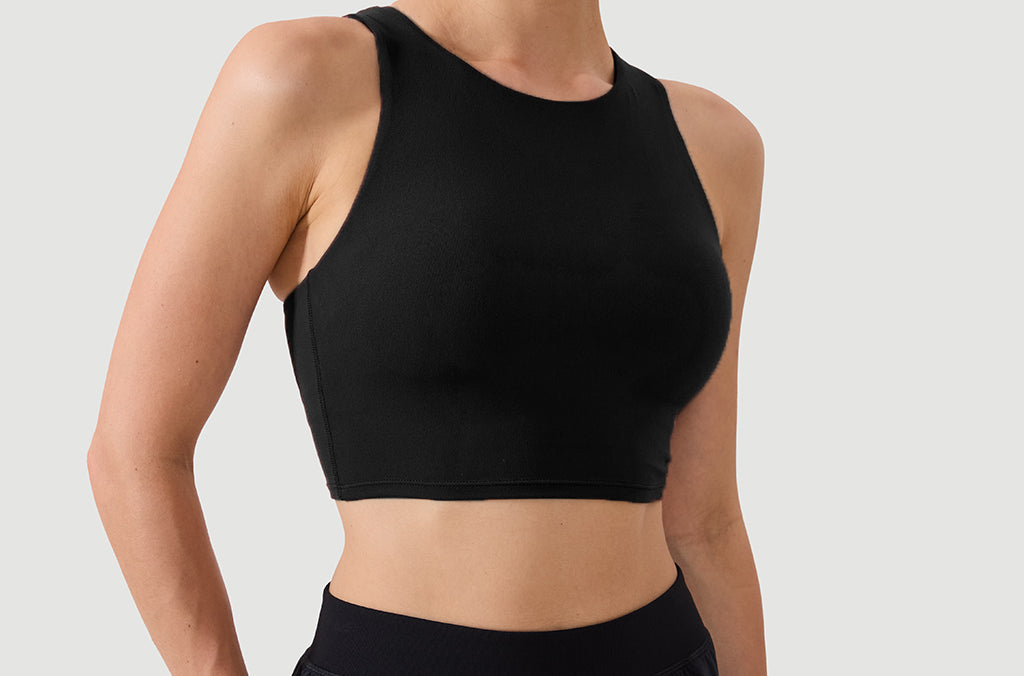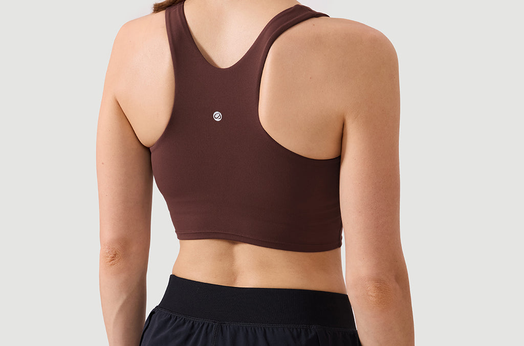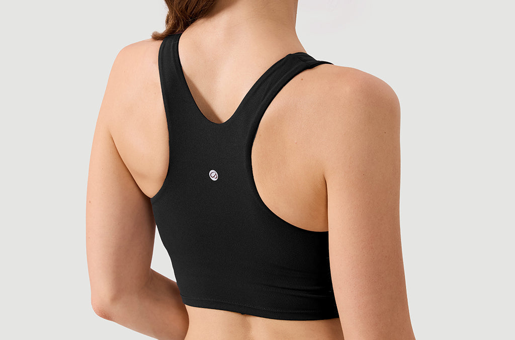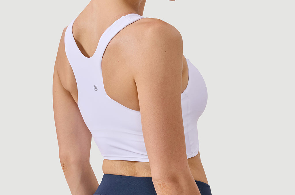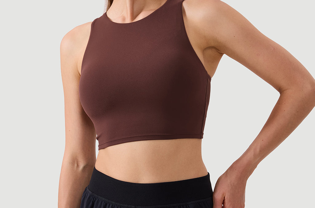 Fall into the lap of luxury. The racerback sports bra helps you reduce shoulder pressure. High neck design avoids extra exposure.