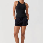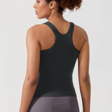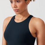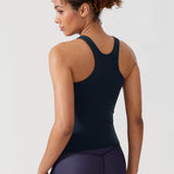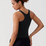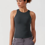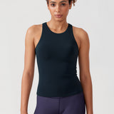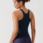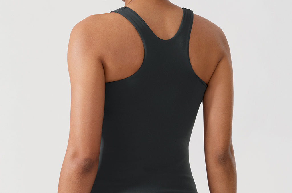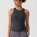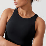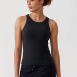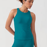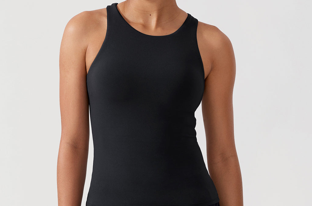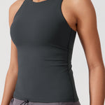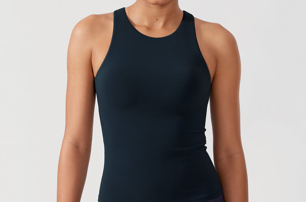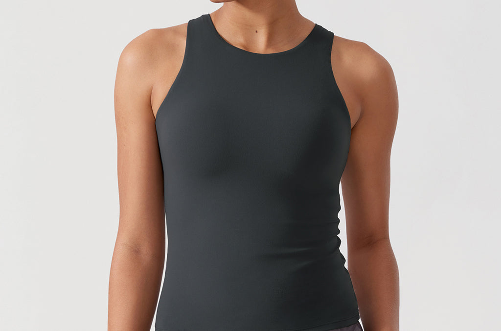 Revel in buttery softness with this racerback tank. Ideal for yoga and lounging, it features high neck design, built-in bra with removable pads, and a slim fit for stylish, unrestricted movement.
