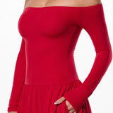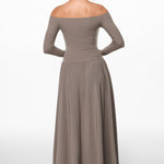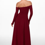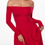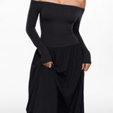This off-the-shoulder maxi dress blends elegance with a flattering, body-skimming fit. Designed with a stretchy double-layered bodice and a softly draped skirt, it highlights your silhouette while offering comfort and ease—perfect for both special occasions and elevated everyday moments.