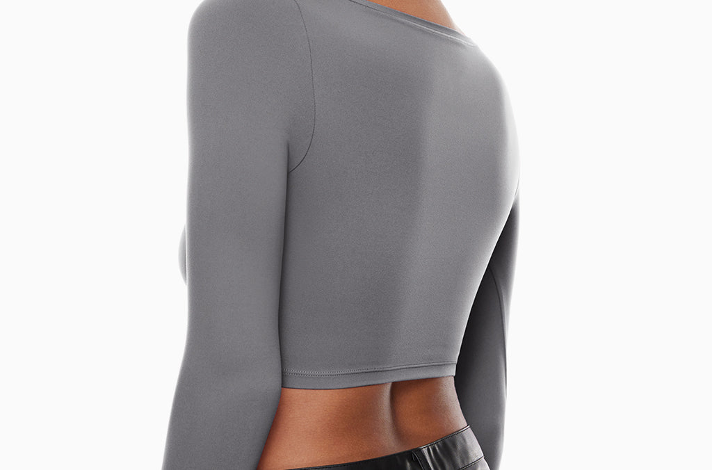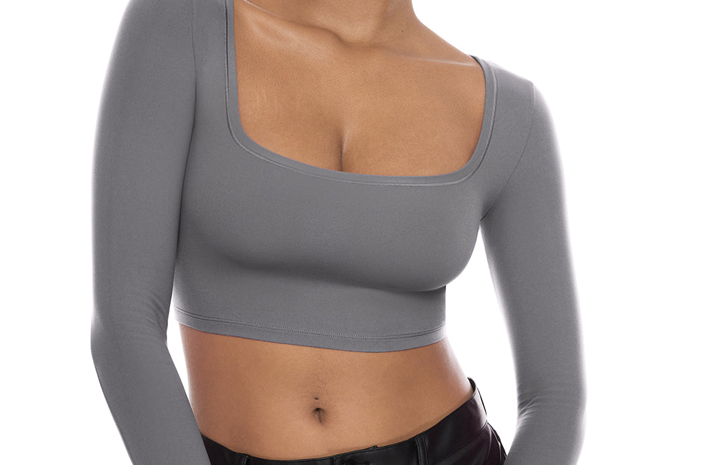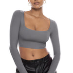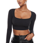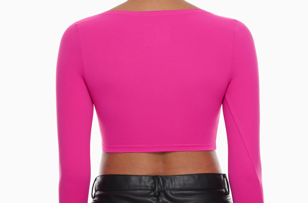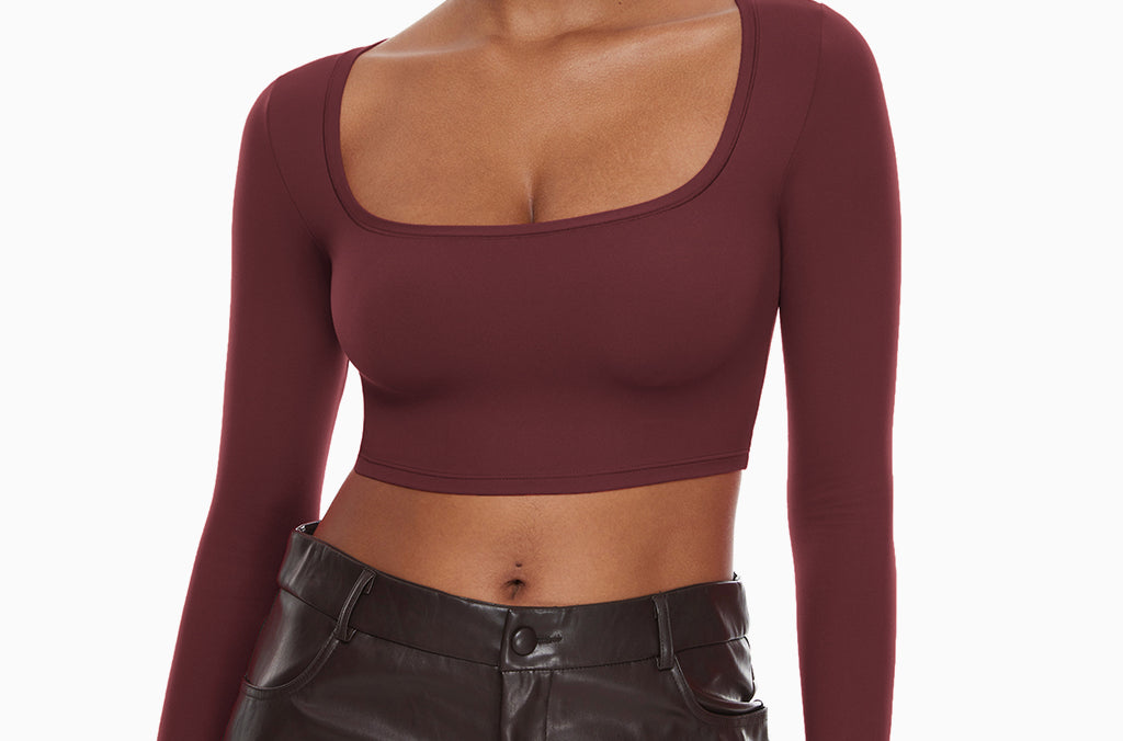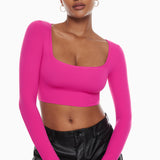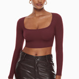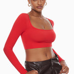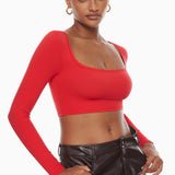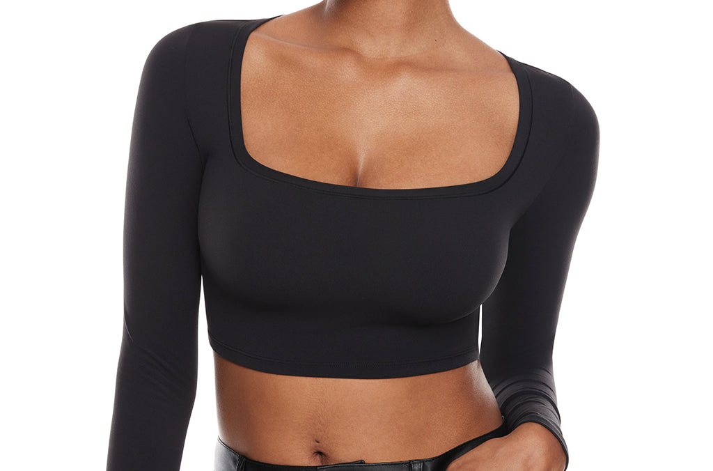"Natrelax" fabric: second-skin feel, never see-through. Chic square neckline, 4-way stretch for a sculpted look. Versatile fitted crop top, perfect day to night