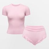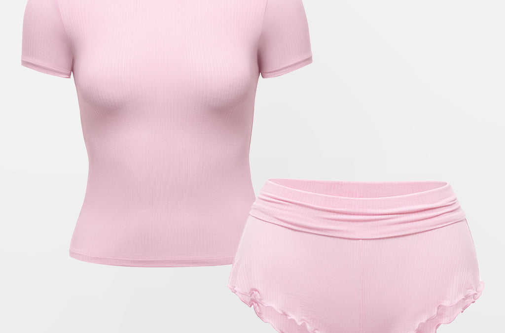 This two-piece lounge set brings together a smooth, fitted shirt and light-as-air fold-over shorts — both designed to move with you and mold to your rhythm. From the flattering cropped cut to the relaxed drape and subtle wave details, it’s the kind of comfort that looks as good as it feels, whether you’re winding down at home or starting the day slow.