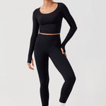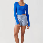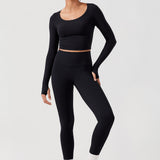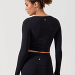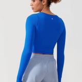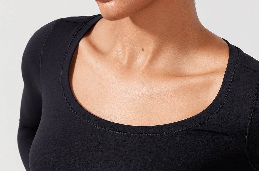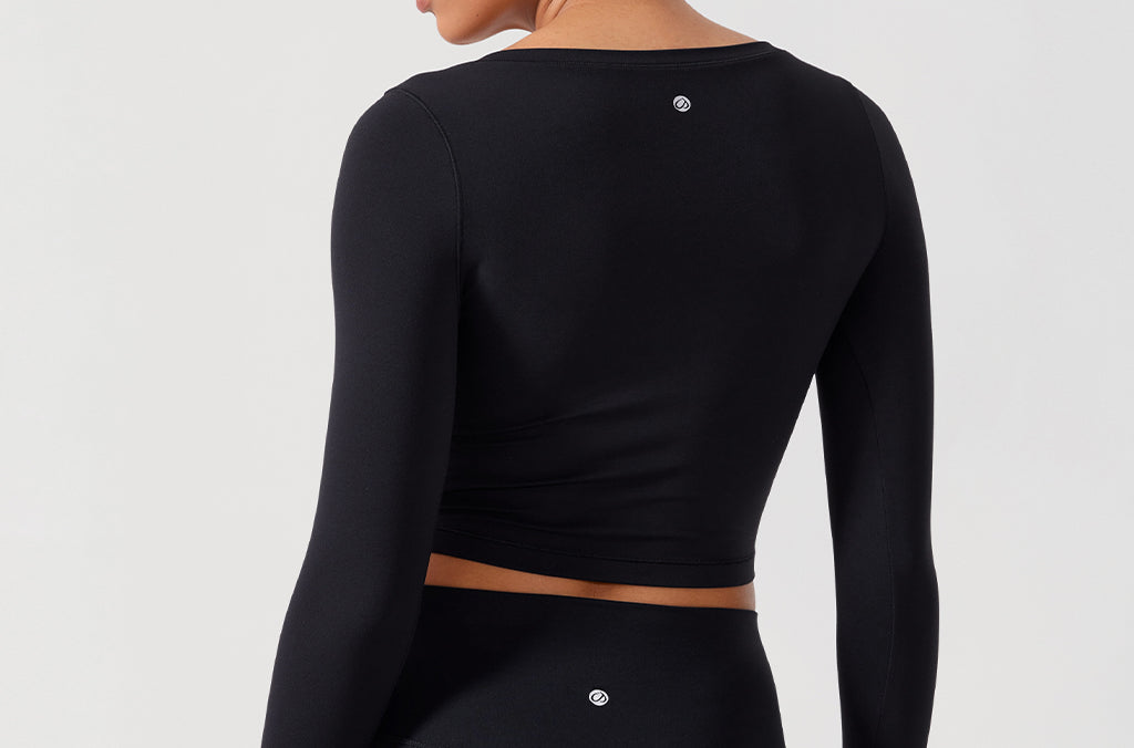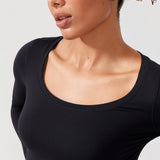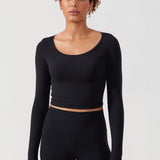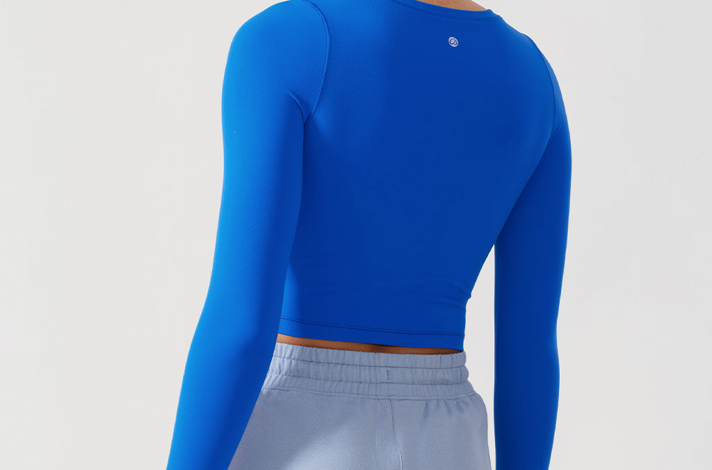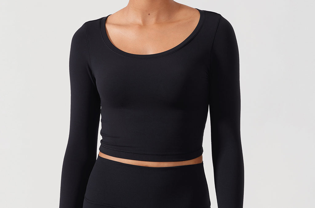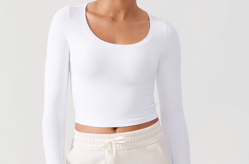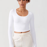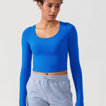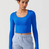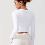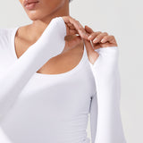 Long sleeves cropped top, suitable for workouts or daily wear. Slim fit, cropped length, thumb holes design. The sexy scoop neck is better for showing your charming neckline.